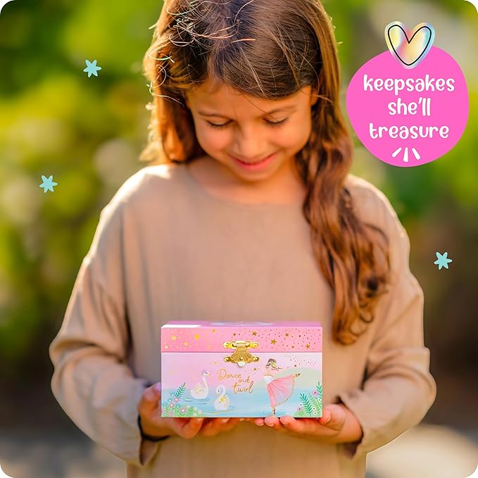 - Ballerina Jewelry Box For Girls - Igniting awe & wonder in imaginative hearts, this musical jewelry box for girls brings radiant smiles to every little girl. Watch as she becomes immersed in the gracefully dancing ballerina, twirling to Swan Lake