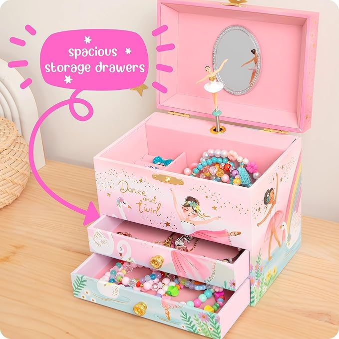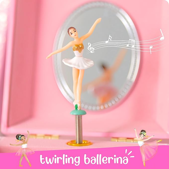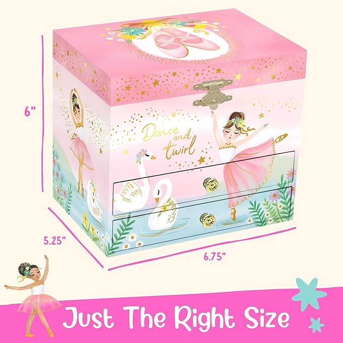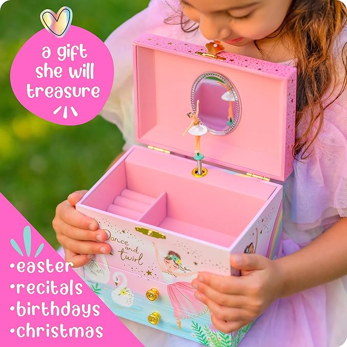 - Ballerina Jewelry Box For Girls - Igniting awe & wonder in imaginative hearts, this musical jewelry box for girls brings radiant smiles to every little girl. Watch as she becomes immersed in the gracefully dancing ballerina, twirling to Swan Lake