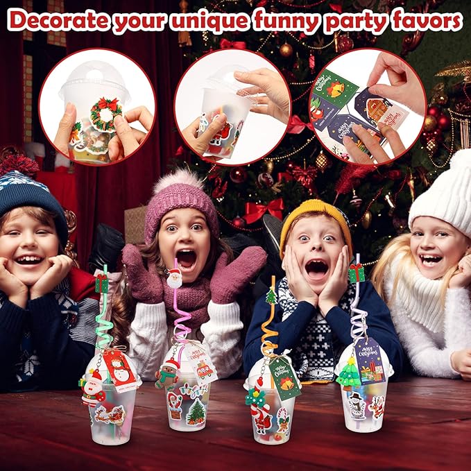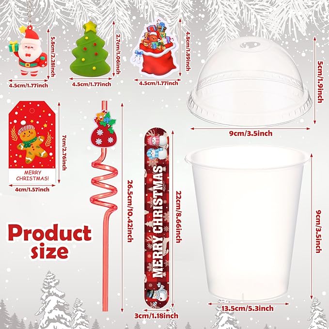 • Plenty of Christmas Party Supplies: you will receive 12 frosted cups with dome lids, 12 Christmas straws, 12 Christmas stress toys, 12 Christmas keychains, 12 Christmas slap bracelets, 50 Christmas gift tags with ropes and 50 Christmas themed stickers, a total of 160 pieces and can be assembled into 12 lovely gift cups, which will become a popular gift at holiday parties