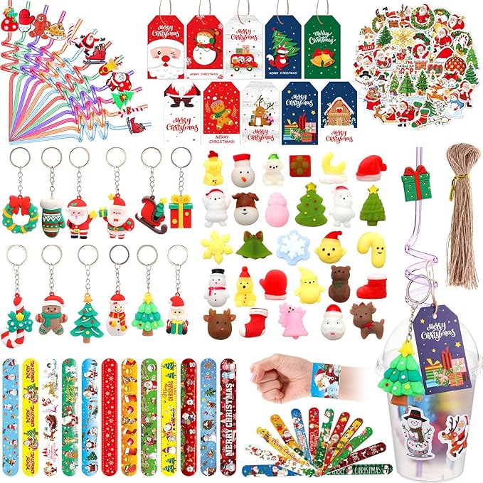 Shappy 160 Pcs Christmas Party Favors Prizes Gift Bulk, Assortment Toys Plastic Cups with Lids Mini Christmas Squeeze Slap Bracelets Straws Sticker Gift Tags and Keychains Xmas Goodie Bags for Kids