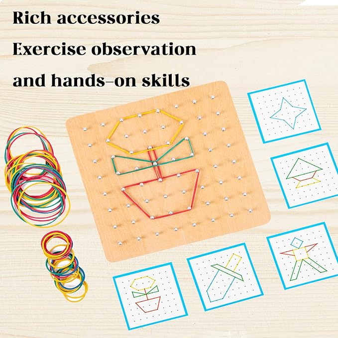 - Anytime and Anywhere - It’s the perfect educational puzzle toy to engage your children with anytime, anywhere. Our wooden toy targets both physical and intellectual growth through developing fine motor skills by manipulating the rubber bands into the nails. Keep your kids occupied everywhere: while traveling, in the car, at home, at school, or in kindergarten