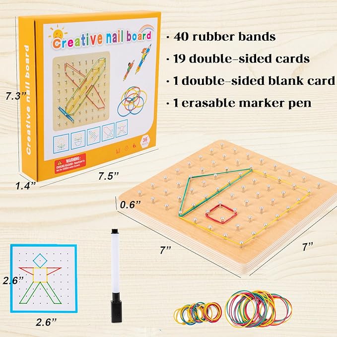 - Geometrical Board: There are 1 wooden board with 64pcs of nails half driven in, 32 pattern cards(2 empty cards & 30 geometric cards),Exquisite Color Box Packaging. The board measures 7 x 7 x 0.9in, weigh 14.4 oz
