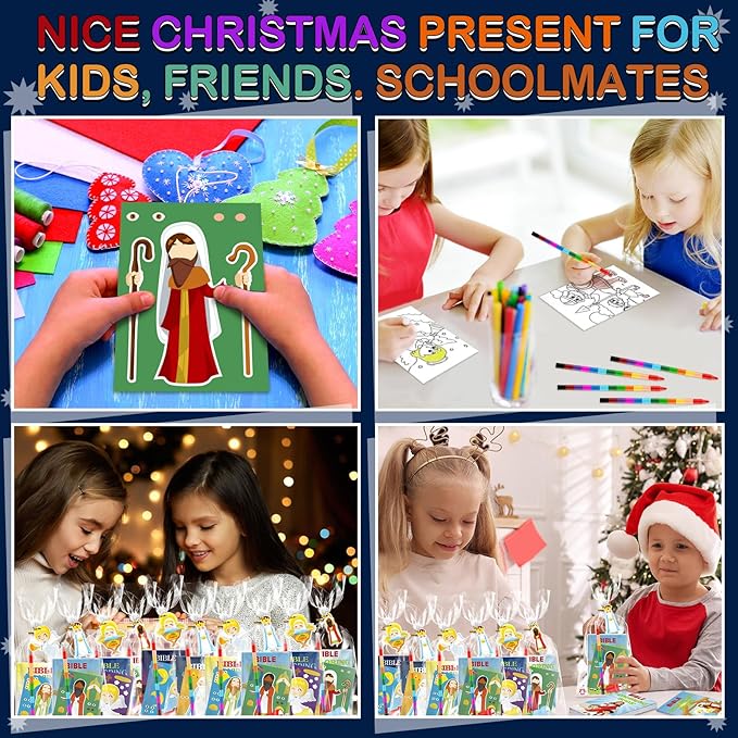 Zhanmai 108 Pcs Christmas Party Favors Bible Coloring Book with Stacking Crayons for Kids Squishes Christmas Toys DIY Sticker Stampers Goodie Bag Fillers Supplies School Educational Reward Prizes