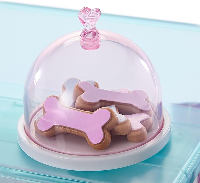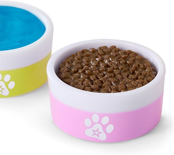 - A pink collar with a purple bow and pet tags, a purple leash that clips into the collar and that dolls can hold, a blue ear bow, a platter with a transparent domed cover that holds a handful of bone-shaped faux treats, a yellow food dish with a paw-print detail and removable “food”, and a pink water dish with a paw-print detail and removable “water”