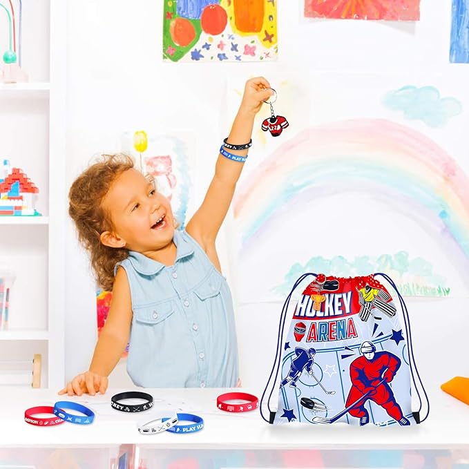 - Classic Hockey Design: Designed with hockey-related patterns and texts, the hockey bags with drawstrings, hockey rubber bracelets, and charm hockey keychains echo the hockey theme party to enhance the atmosphere; Our hockey birthday party supplies can be matched with your hockey-style outfit, wearing them to a hockey themed party to make you glamorous and the focus of the crowd.