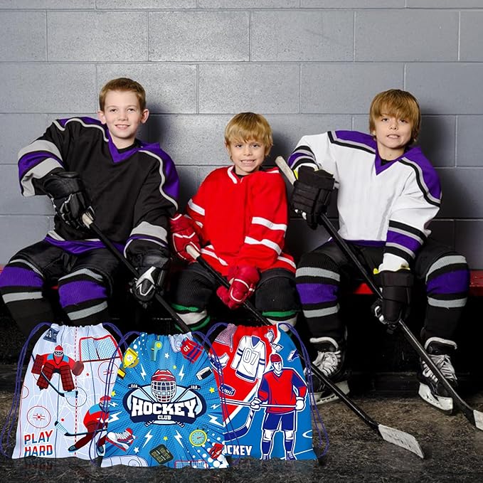 - You Will Get: You will get a total of 36 pieces of ice hockey party favors, including 12 pieces of drawstring hockey gift goodie bags with 4 different styles, 12 pieces of hockey rubber bracelets with 4 colors / 6 different styles, and 12 pieces of colorful hockey keychains; enough quantity and cool styles can meet your needs for various kinds of ice hockey parties.