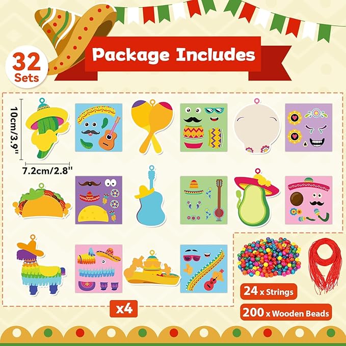 Qyeahkj Mexican Fiesta Craft Kit for Kids - 32 Pack DIY Necklaces, Taco Stickers, Arts Hanging Decoration, Party Supplies Favor, Ideal for Classroom Activities & Gift Exchange