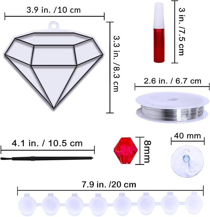 - Size: The Jewel Suncatchers are approximately 4" in diameter. Each bottle of suncatcher paint has a capacity of 0.2 fl oz/6ml, and each mini empty paint pot holds 0.06 fl oz/2ml of paint. The acrylic beads are about 0.3" in diameter, the fishing thread is 393" long, and each suction hook is about 2.3" in diameter. These jewel window art decorations are perfect for hanging in windows, glass doors, gardens, and porches.