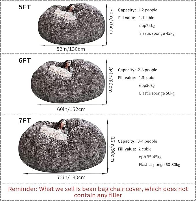 - 5ft=130*60CM(Capacity:1-2 people ); 6ft=150*75cm (Capacity: 2-3 people ); 7ft=180*90cm (Capacity: 3-4 people) ; (Measurements are taken from an unfilled bean bag.) Package Included: 1 x Sofa Bean Bag Cover (NO Filler) Perfect for sprawling out on your own in living rooms, dorm rooms, rec rooms and bedrooms.(ONLY COVER, NO FILLER )