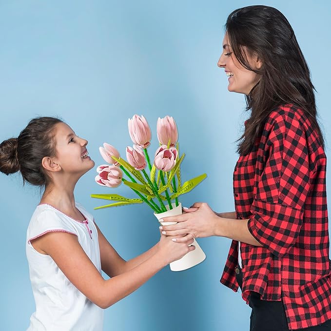 Flower Bouquet Building Toy Set Tulips, Botanical Building Blocks for Adults Home Office Decor Pink Color