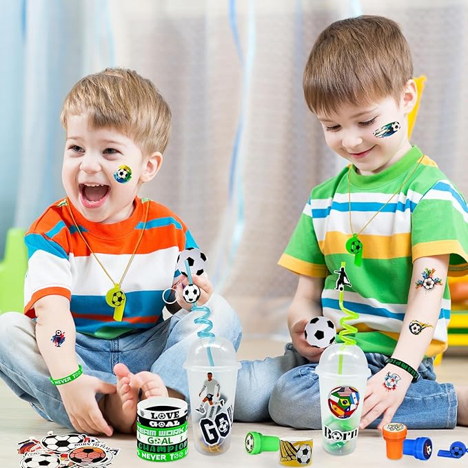 Cinrobiye 146 Pcs Soccer Party Favors, Sports Party Supplies with Cup Straw Soccer Keychain Tattoo Sticker Slap Bracelet Whistle Treat Bag Gifts for Classroom Rewards Soccer Birthday Party (Soccer)