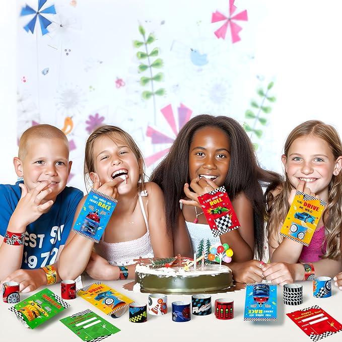 ANGOLIO 28 PCS Valentine's Day Race Cars Slap Bracelet with Gift Cards for School Greeting Gifts Exchange Valentine's Day Race Car Toys Set Classroom Prize Goodies Bag