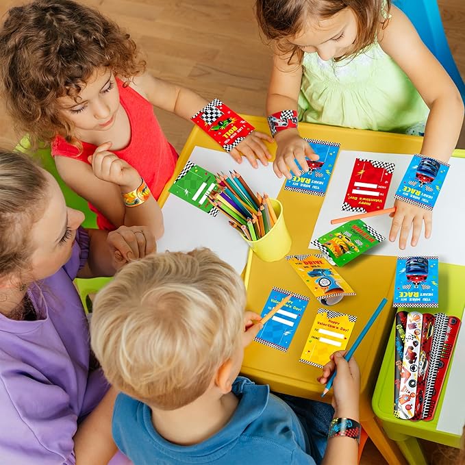 - You Will Receive: 4 Happy Valentine's Day racing cards with 7 cards each, with different racing patterns printed on both sides. You can write blessings on the cards. 28 slap bracelets, including 12 styles, each with 2 pieces, the remaining 4 are random styles