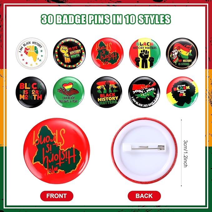 - Suitable Size: sized appropriately for all ages, these snap wristbands and badge buttons are crafted to fit everyone, the black history month pins measure about 1.2 inches/ 30 mm, easy to pin on clothes or backpacks, the black history wristbands are about 8.7 inches/ 220 mm in length and 1.2 inches/ 30 mm in width, suitable for adorning wrists and play well as unique accessories for Black History Month or Freedom Day patriotic party