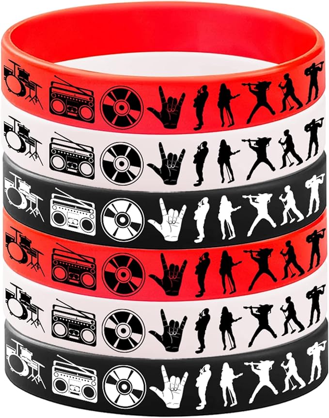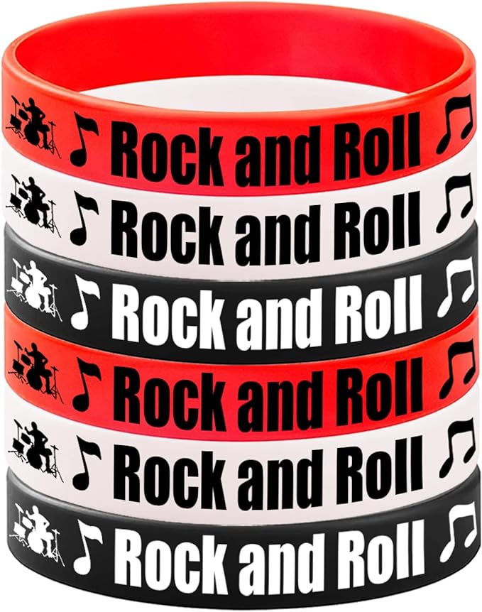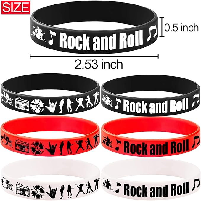 - Rock and roll Silicone Bracelets Set:24 pieces of rock and roll themed rubber bracelets with 3 different colors, black,red and white.
