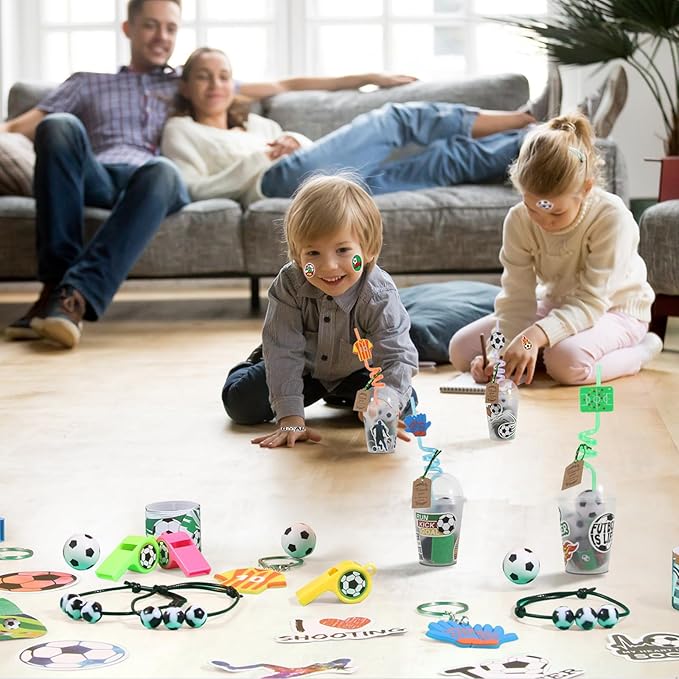 - Quality and Reliable Material: soccer bracelets are made of quality materials, soccer straws and whistles are made of ABS plastic, mini soccer are made of PU materials, soccer themed stickers are made of PVC; The cup is made of quality PP material, and the thank you tag is made of Kraft paper, which is reliable and safe to use, not easy to fade or break, reusable and sturdy.