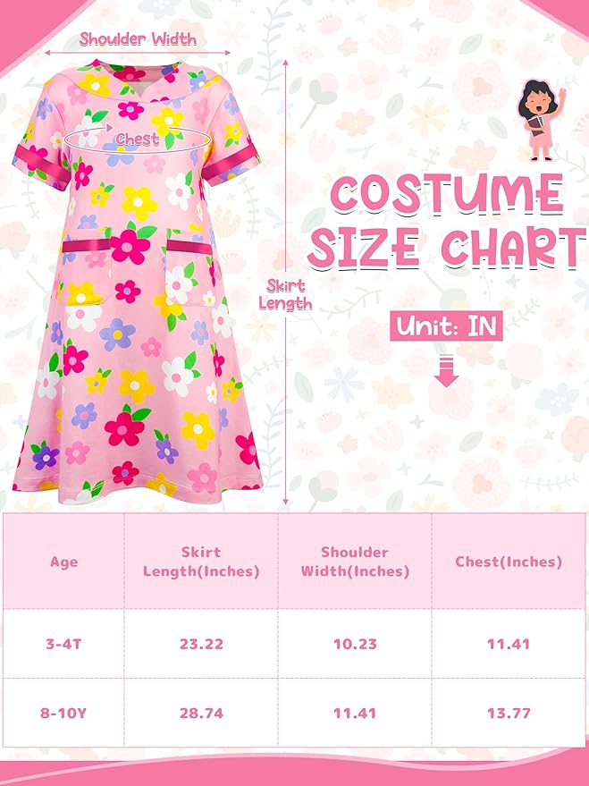- Product Size - Our old lady outfit for kids with a range of sizes of M, L, XL, ensuring an comfortable fit for most girls. The old lady wig is 13.4 in, the wig cap is elastic, making it suitable for all kids. With a 16.53-inch pearl necklace, a 7-inch pearl bracelet, 5.11-inch grandma glasses, 25.7-inch glasses chain, and a 35.43-inch walking cane.