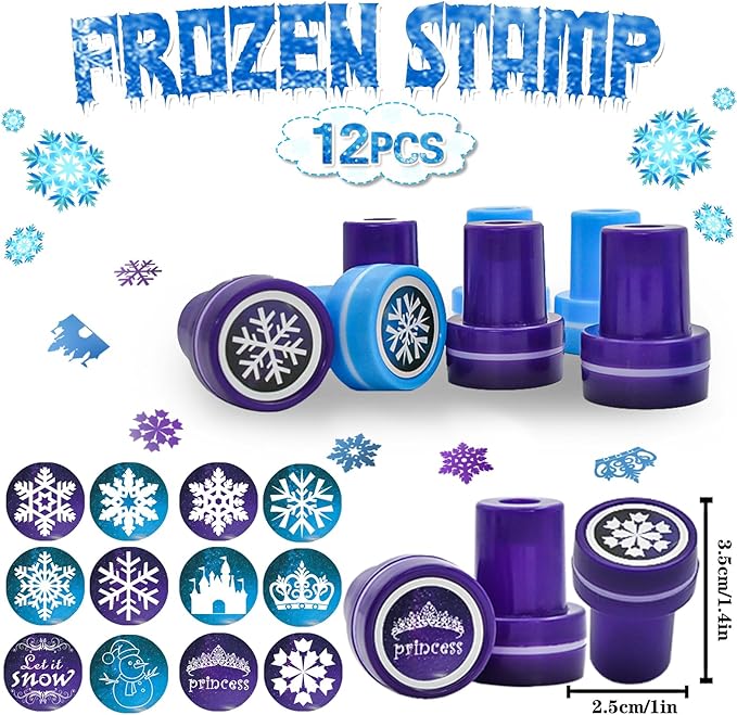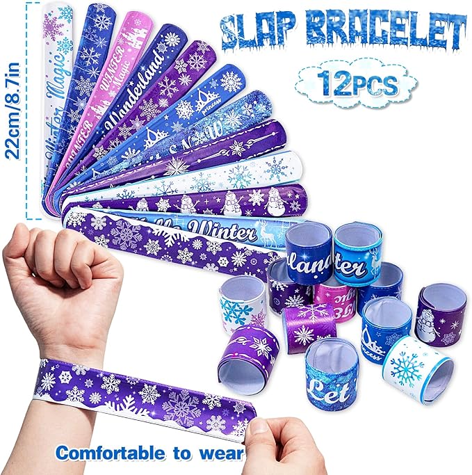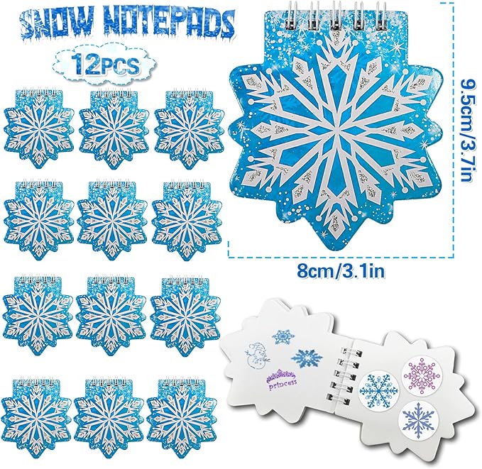 - Snowflake Party Favors: Snowflake birthday party supplies include 12 Invisible ink pen (purple and blue),12 Snowflake notebook,12 Slap Bracelets (12 styles),12 Snowflake silicone keychains(3 colors), 12 Stampers with different patterns,1 Snowflake sticker (8 styles).