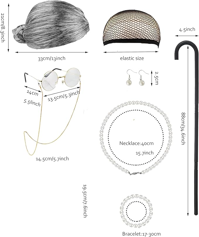 • 1:Package includes 6 pcs: 1 Wig with Curles and Wig Cap,1 Cotton Dress,1 Glasses with Chains Strap, 1 Cane,1 Necklace.