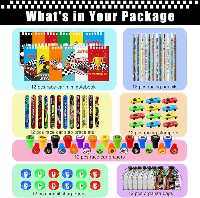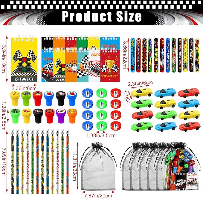 - Racing Car Party Favors Set: you will receive 84 pieces of race car birthday party favors, including 12 pieces of race car spiral notebooks, 12 pieces of racing slap bracelets, 12 pieces of race pencils, 12 pieces of racing stampers, 12 pieces of race car erasers, 12 pieces of sharpeners, come with 12 pieces of organza bags for gift packaging