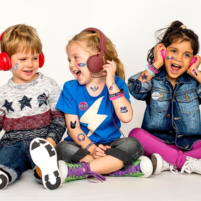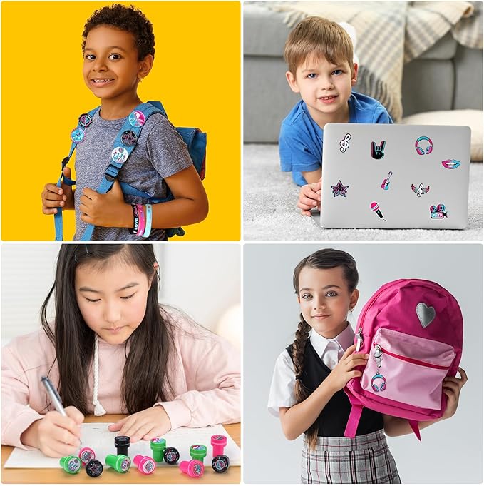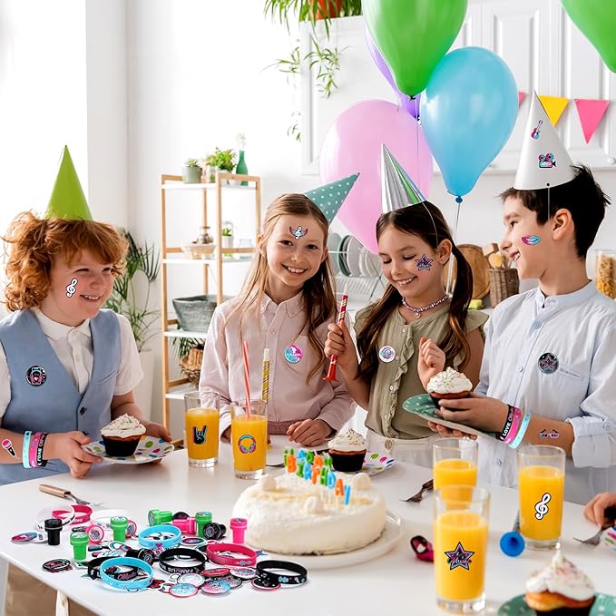 - Music Theme Design: these music theme party favors are printed with musical notes, headphones, radios, guitars, records, microphones and other elements in bright colors and distinctive styles; Silicone bracelets and stampers are printed with bright music themed text on the surface to enhance the atmosphere of your themed party