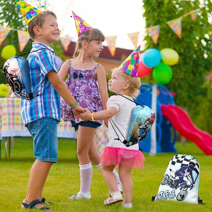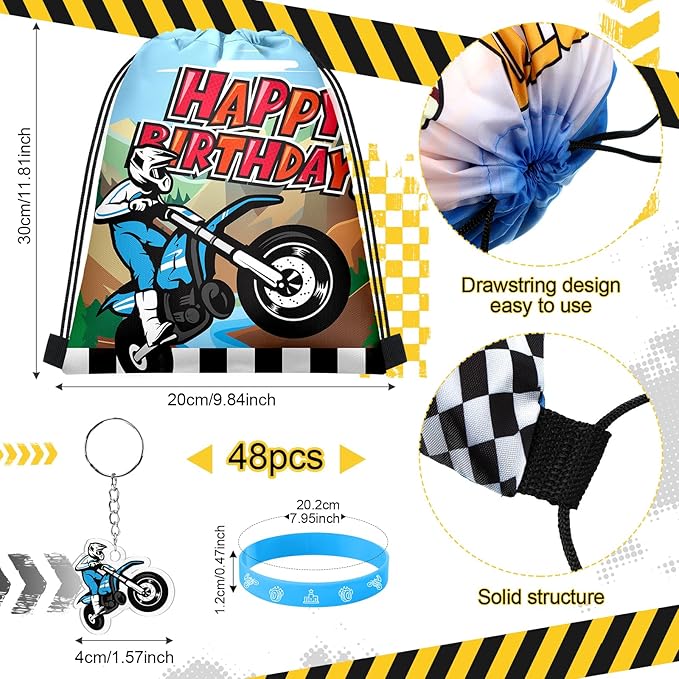 Talltalk 48 Pcs Dirt Bike Party Favors for Boy Motocross Birthday Decorations 16 Motorcycle Party Drawstring Bag Racing Candy Goodie Snacks Gift Bag 16 Wristband 16 Keychain for Baby Shower Birthday