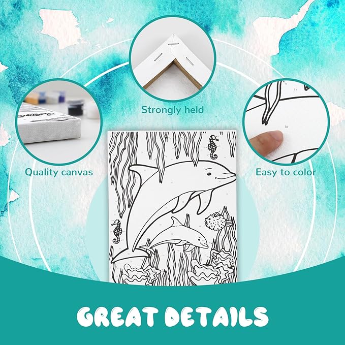 - Premium Art Aupplies: Comes with 3 pack 8x10 inch pre drawn canvas,butterfly, dolphin and alpaca; 18 high-quality paint, 5 brushes and 3 easy to follow cards for kids to create vibrant colors and designs;