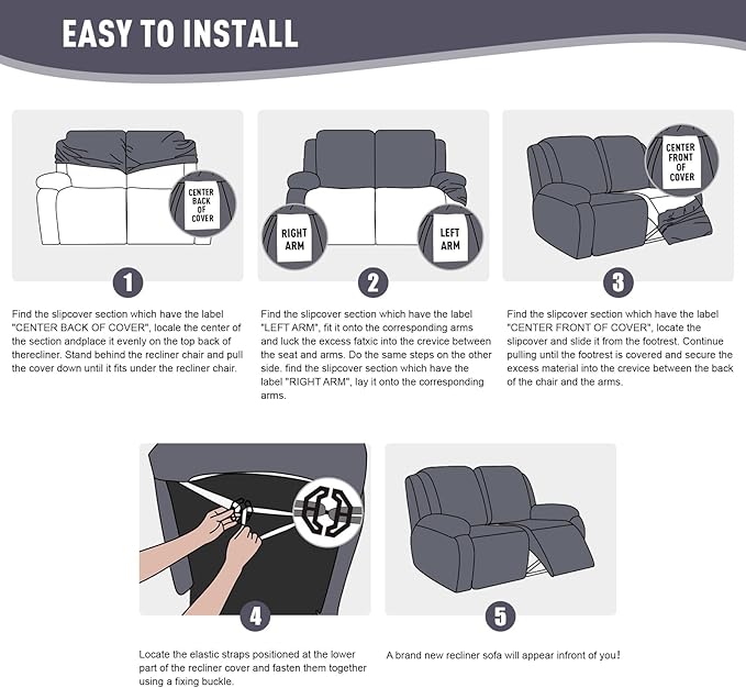 • EASY TO INSTALL: Our loveseat recliner covers have exquisite workmanship, a total of 6 pieces set, including 2 seat covers, 2 armrest covers, 2 cushion covers. The recliner covers also equips with bottom elastic and reinforcement straps, you can use buckle to make the cover in place without moving