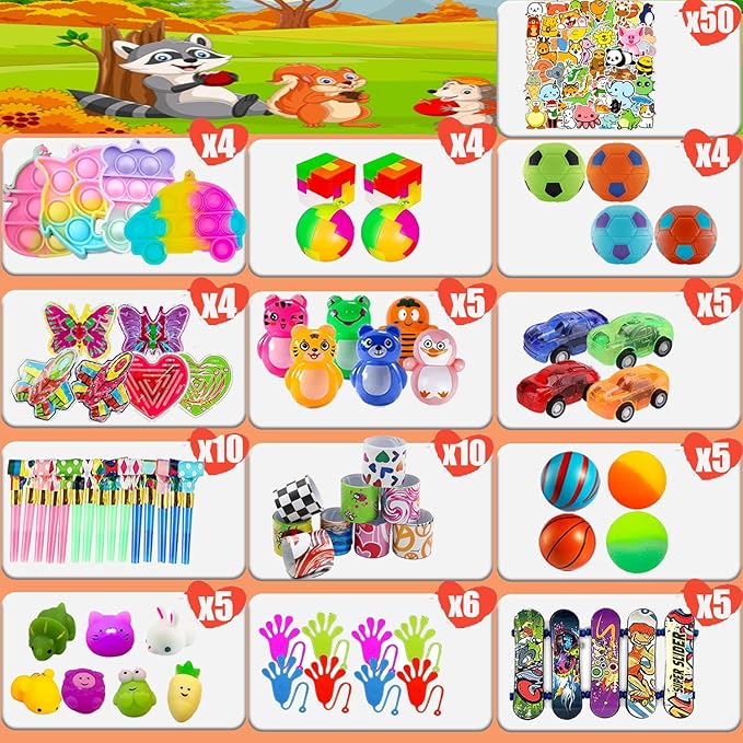 - Assortment Party Favors Toys Set: Assortment premium party favors toys set include 10 slap bracelets, 10 party blower, 6 sticky hands, 5 tumbler toys, 5 bouncy balls, 5 pull back cars, 5 mochi squishys, 5 mini skateboards, 4 pop keychain, 4 soccer spinner, 4 puzzle, 4 maze puzzle, 50 animal stickers. Total 117 Pcs toys for kids classroom prizes.