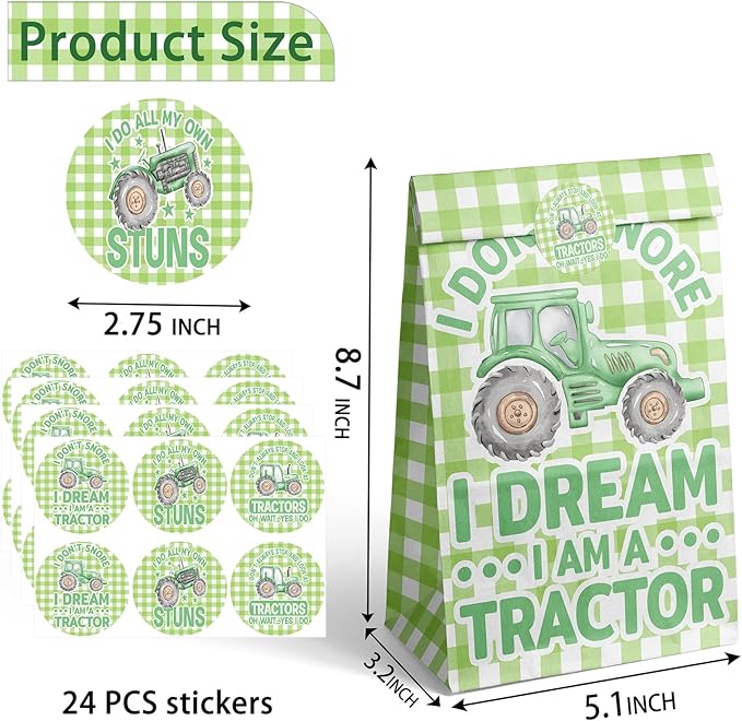 - Complete Package - Each package includes 24 meticulously crafted Tractor themed paper bags and 24 vibrant stickers featuring delightful tractor designs. Feel free to mix and match stickers and bags to tailor the theme to your liking.