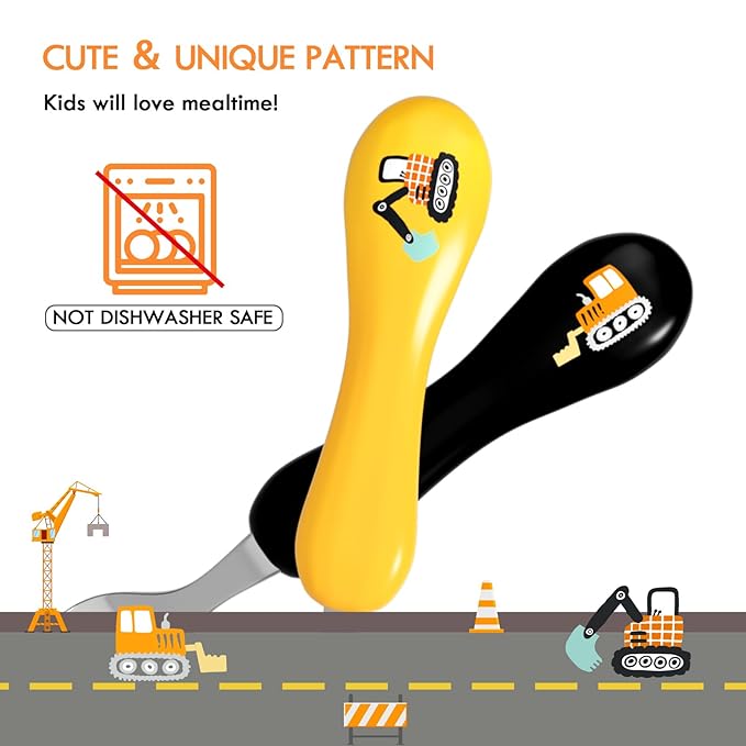 Lehoo Castle Toddler Fork and Spoon, 6pcs Toddler Utensils Kids Silverware, Safe Stainless Steel Toddler Fork Spoon Set, Children Flatware Set, Incudes 3 Spoons and 3 Forks (Engineering Vehicle)