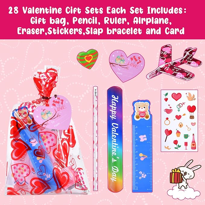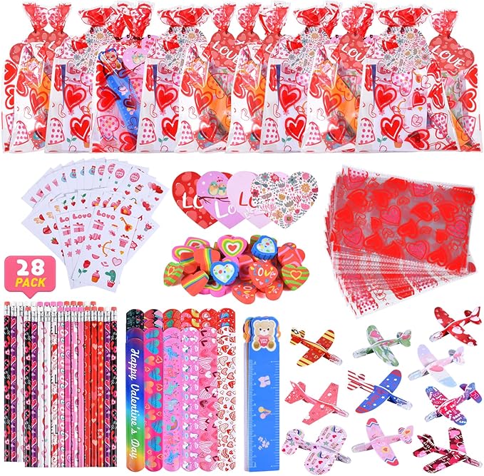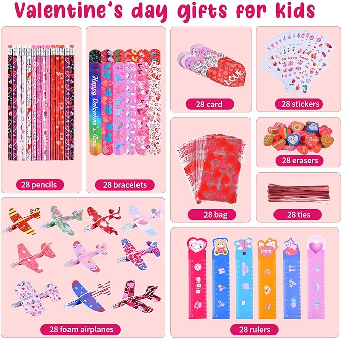 - 【Super Value Valentines Day Gifts for Kids】 this assorted stationery set contains 28 Valentines Day cards, 28 Valentine pencils, 28 Valentine’s heart erasers, 28 Valentine stickers, 28 Valentine foam airplanes, 28 Valentine rulers, 28 Valentine slap bracelets, 28 valentines goodie bags.A total of 224 pieces to meet kids’ need used for school classroom gift exchange party treats.