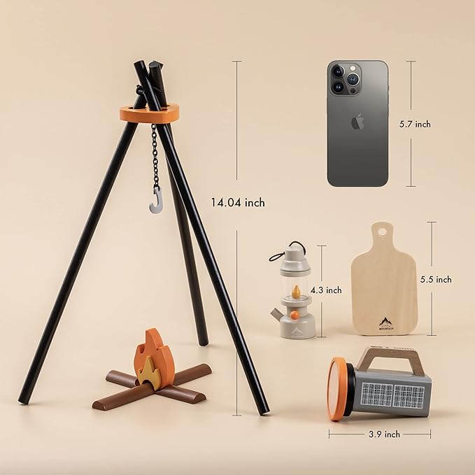 • ⛺Safe and Durable Materials: Crafted from durable wood and coated with non-toxic water paint, this camping playset prioritizes safety. The meticulous construction ensures a smooth finish without any burrs or splinters, making it a perfect gift for your little adventurers on birthdays, Christmas, and other festivals.