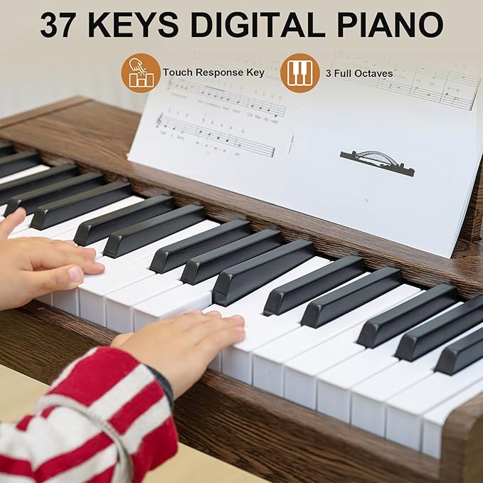 Kids Keyboard Piano, 37 Keys Digital Piano, Toddler Musical Instruments, Wooden Kids Piano with Bench, Toddler Piano for 3+ Girls and Boys, Walnut