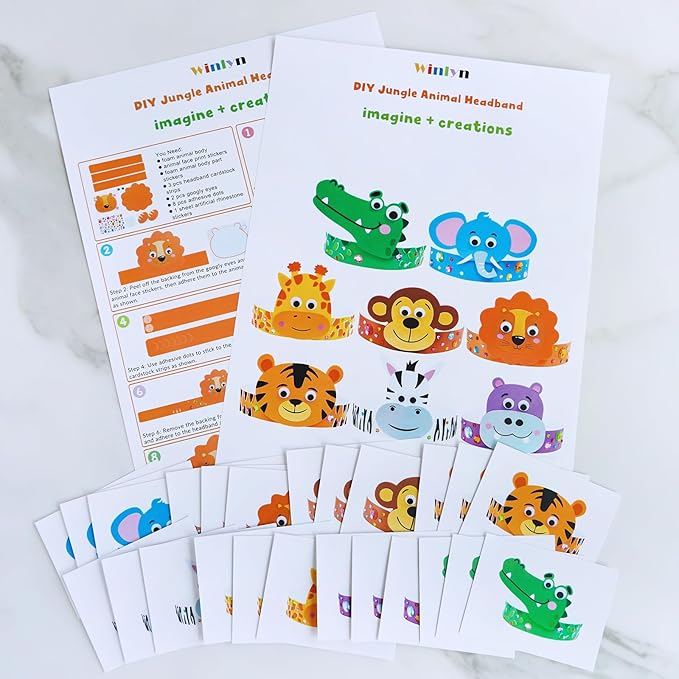 - 24 Jungle Animal Headbands Craft Kits: This kit provides materials to craft 24 peel-and-stick jungle animal headbands. Includes 24 cardstock headband bases, 48 adjustable strips, 24 foam bases in 6 jungle animal shapes (tigers, lions, monkeys, zebras, hippos, giraffes, elephants, and alligators), matching 24 sets paper face stickers, 24 sets foam animal-feature stickers. 48 googly eyes, 200 adhesive dots, 2 jewel stickers sheets, 24 treat bags, 24 twist ties, 24 gift stickers, 2 guides.