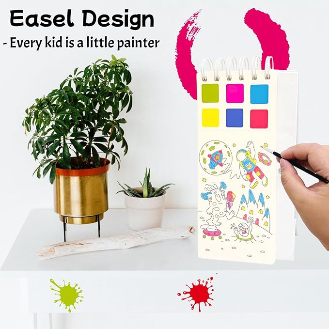 - Water Coloring Book: Made of coloring paper, comes with little brush and easel that designed for kids; Each drawing paper has 6 different colors of pigments; Besides, our painting book adds four new spare pages of pigments, we don't worry about they are not enough to paint anymore