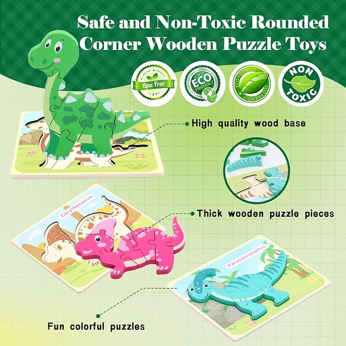3 Pack Dinosaur Wooden Puzzles for Toddlers,Montessori Toys Dinosaur Puzzle for Kid 3 Year Old,Preschool Educational Learning Colorful Toys Gifts