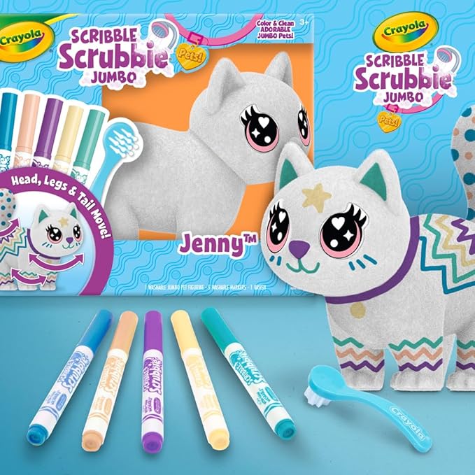 - SCRIBBLE SCRUBBIE PETS JUMBO: Features 1 Jumbo Scribble Scrubbie Pet that can be posed, 1 Brush, and 5 Washable Markers to color with!