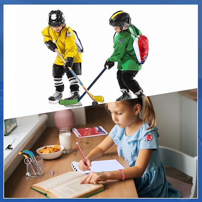 - Educational and Interactive: in addition to being ideal party decorations and gifts, these hockey party supplies can also serve as educational learning items; The spiral notebooks and bendable pencils allow children to explore their creativity and practice their writing skills, art theme stickers encourage problem solving and imagination, improving children's hand eye coordination, cooperation, thinking ability and imagination