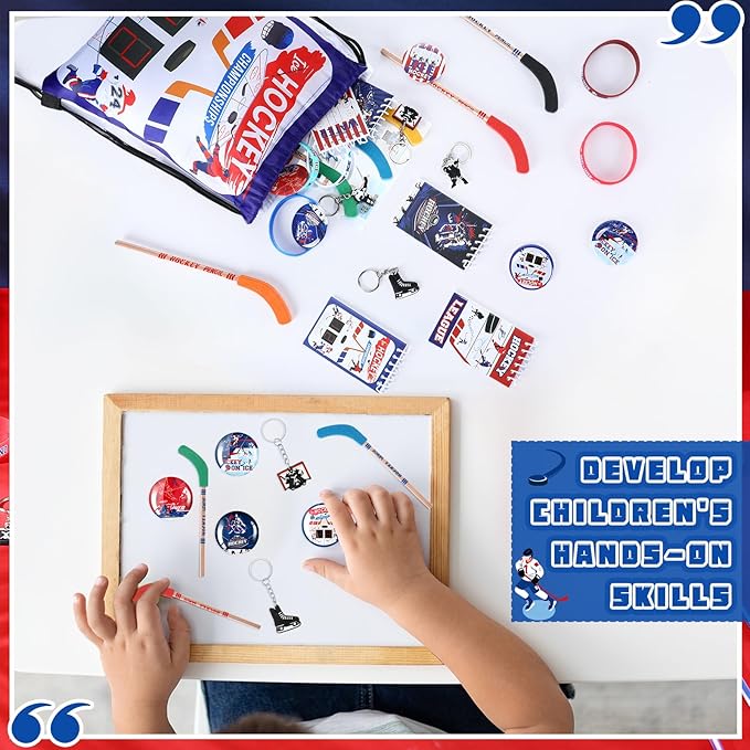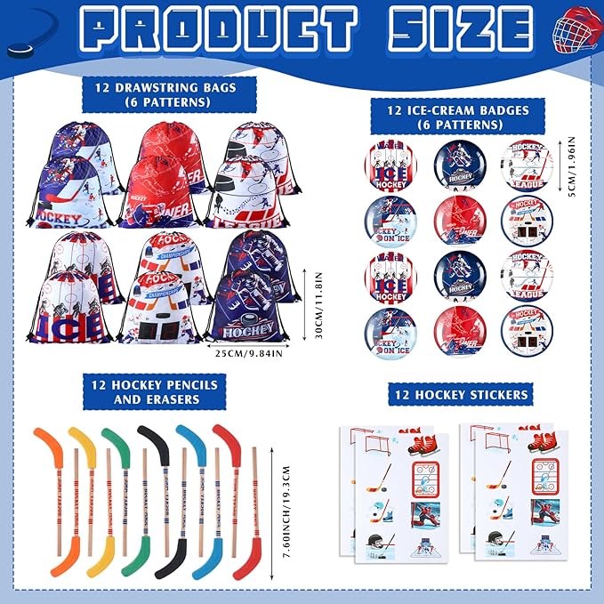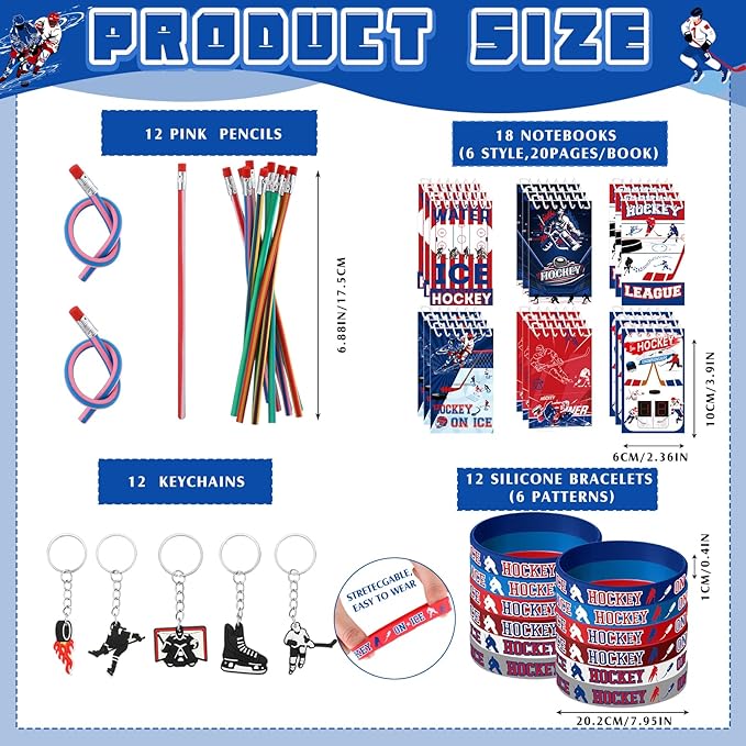 - Assorted Hockey Party Favors: this set of hockey party decorations contains 12 hockey drawstring bags, 18 spiral notebooks, 12 badge buttons, 12 silicone bracelets, 24 bookmarks, 12 hockey pencils, 50 stickers in 1 pack, and 12 hockey keychains, a sufficient quantity and diverse styles to gift your guests; This complete set will save you time and effort, helping you hold a wonderful party