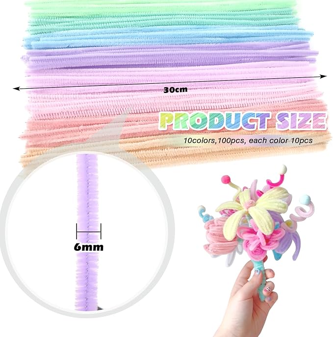 - Size: 100pcs mixed colors pipe cleaners; 0.24 X 12 inch (6 mm X 300 mm). Enough quantity to meet your various needs of DIY craft creations