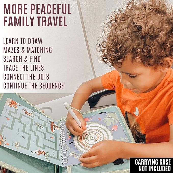- KIDS TRAVEL ESSENTIALS: Mess free dry erase activity book with 18 simple, colorful erasable themed activities like tracing, mazes, drawing, search and find and more. Perfect travel toys for toddlers, kids car activities, plane travel, restaurants or any unexpected waits. Includes a full set of high-quality easy peel reusable stickers that attach to the pages of the activity book, or to car or airplane windows.