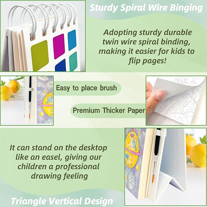 - Easel Book Design: Mess-free watercolor painting book adopts a unique triangular vertical design that can make the painting book easily stand on the table to turn into a small easel; let our kids become little painters, and drawing also becomes more interesting and more professional