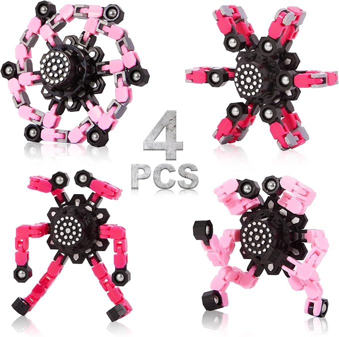 - 【Transformable Finger Gyros】4 Pink colors (pink/pink&grey/rose gold/rose gold&grey) finger spinners included. Each fidget spinner has six deformable chains. Each of the links can pivot and lock into 5 positions, you can create any shapes you want, such as various shapes of spinners, robots and even mobile phone holders. It can also exercise your kid’s hands-on ability, hand-eye coordination and logical thinking ability by changing the shape of the toys