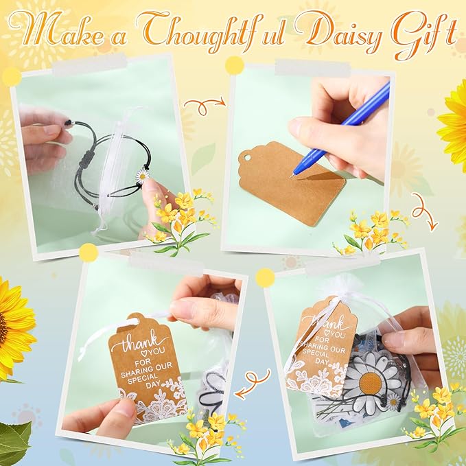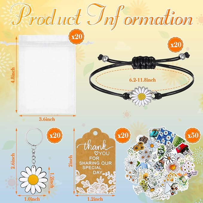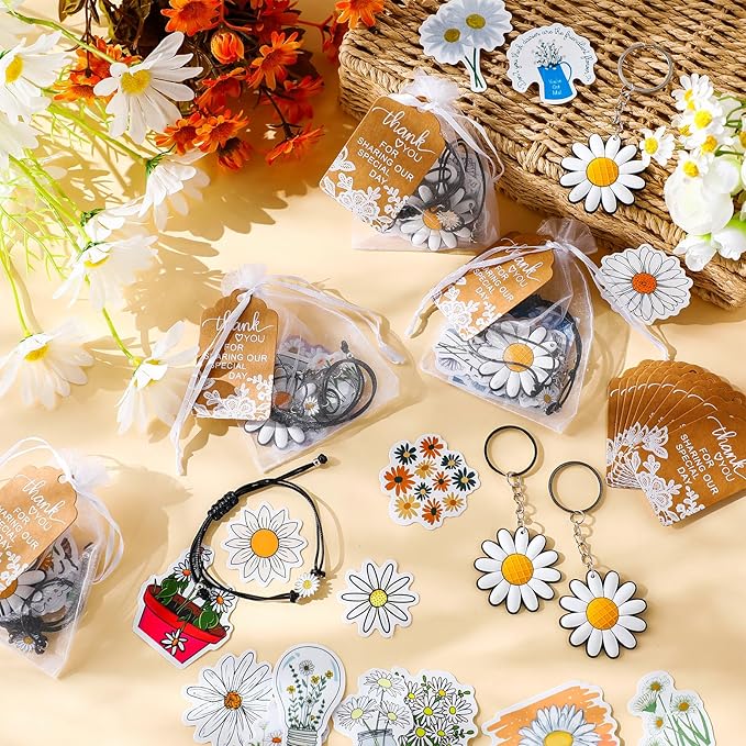 - Daisy Party Gift Set: you will receive 20 pieces of daisy flower keychains, 20 pieces of daisy bracelets, 20 pieces of thank you kraft tags, 50 pieces of daisy stickers, 20 pieces of organza bags, abundant in quantity, meeting your different decorative needs, enough to share with your friends