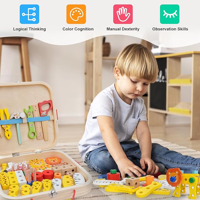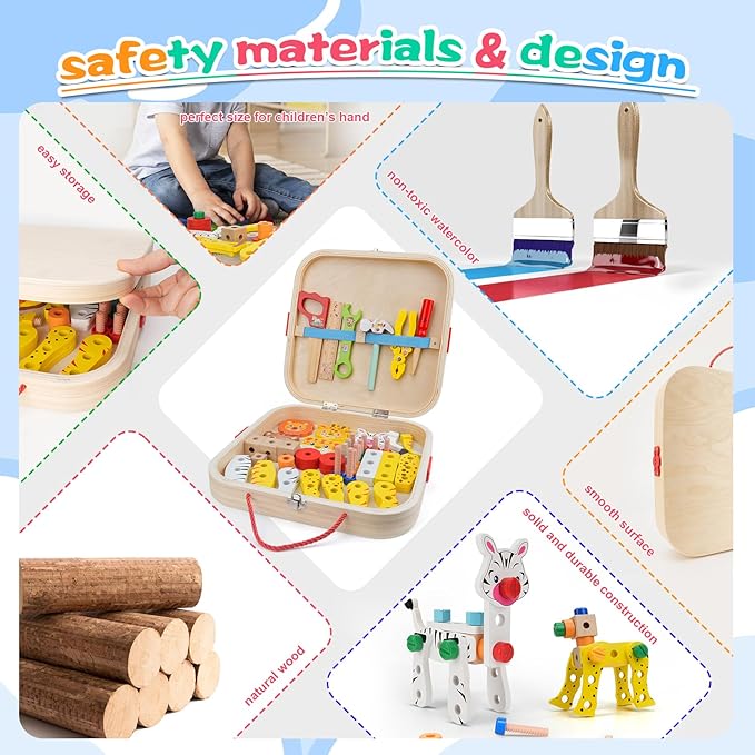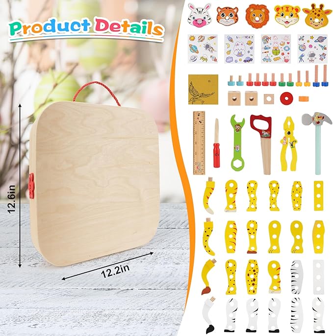 • 🧰【Animal assembly toy box】 This wooden assembly toy set includes wooden blocks, screws/nuts, animal blocks, stickers, and various assembly tools; Rich building block components can allow children to fully unleash their imagination and creativity to become a little inventors.