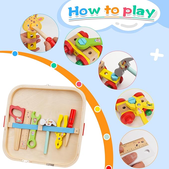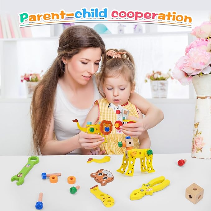 • 🔨【Become a little inventor】 The set is equipped with a wealth of building block parts and assembly tools, including screwdrivers, wrenches, hammers, pliers, rulers and saws. It is made entirely of wood, allowing children to create freely and safely simulate the toy repair process. This toy set can not only assemble animals, but also use your imagination to assemble cars, tanks, etc.