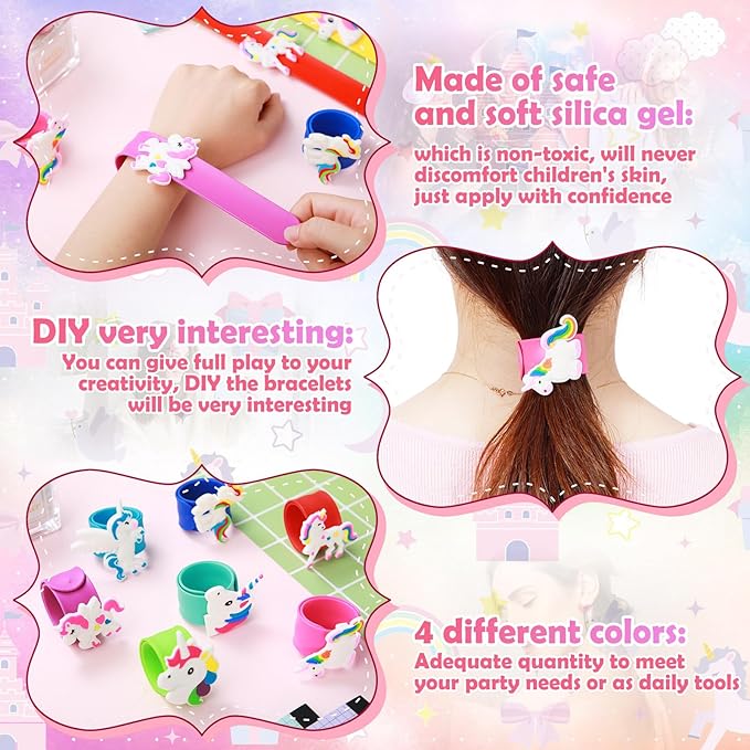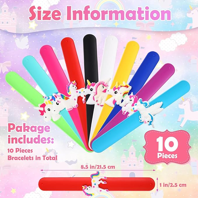- Party Favors: these unicorn bracelets are suitable for many occasions; Be it for unicorn themed parties, birthday gifts, game prizes, or as a reward for your child, these silicone slap bracelets are the suitable choice; Packaged perfectly with 10 Unicorn slap bracelet, bring a radiant smile to every little face with this exciting party favor