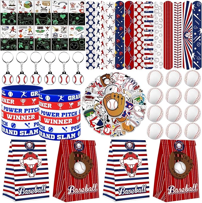 - ⚾【BASEBALL PARTY FAVORS】Including 12 sheets of baseball temporary tattoos, 12 baseball keychains, 12 baseball silicone bracelets, 12 baseball slap bracelets, 12 mini baseball stress balls, 50 baseball stickers, 12 baseball gift bags. Each item is designed to meet your diverse party needs with ample quantities