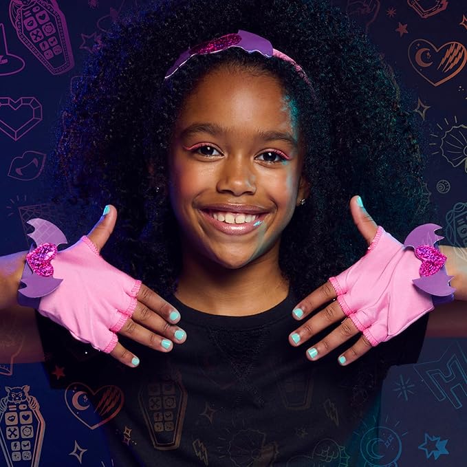 - Creep-tastic Accessories: Amp up the charm with vibrant pink fingerless gloves and matching headband with purple bat wings and glittery, pink heart accents.